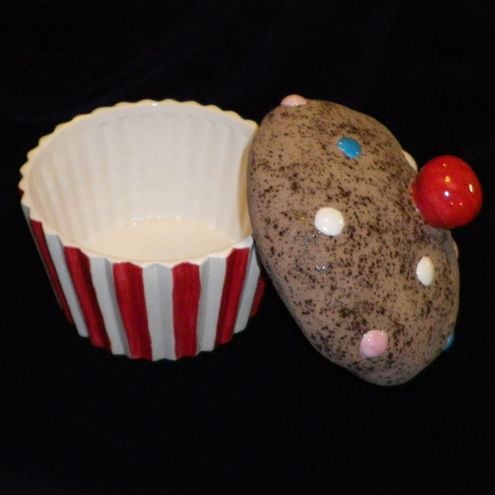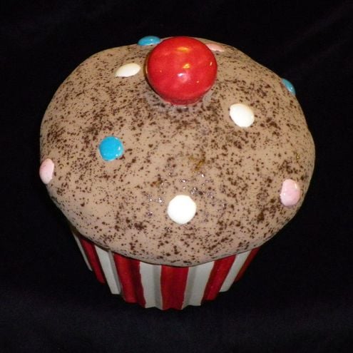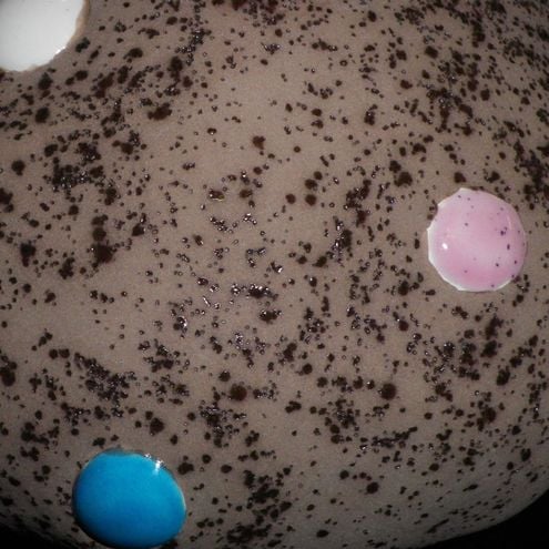 Slip moulded from white earthenware clay, I have glazed it in an amazing chocolate crystal glaze, with coloured "smarties".