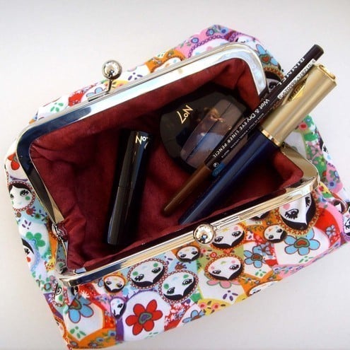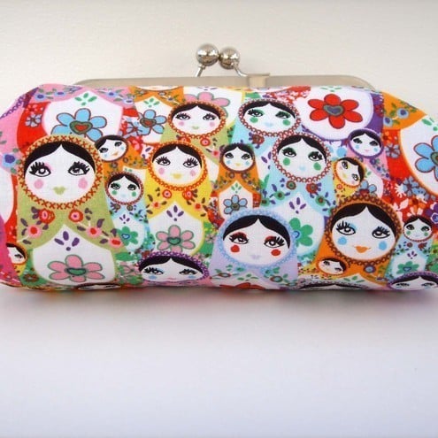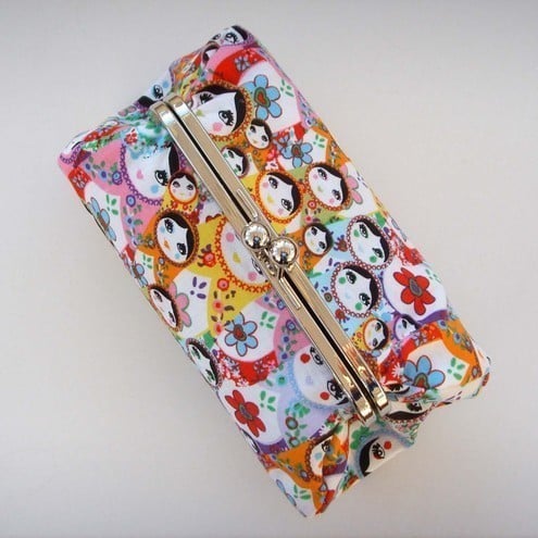 Perfect little clutch for your mobile phone, keys, sunglasses,change and credit cards or even a make-up bag. Pretty Russian doll fabric with contrasting lining, padding and metal frame clasp.