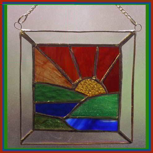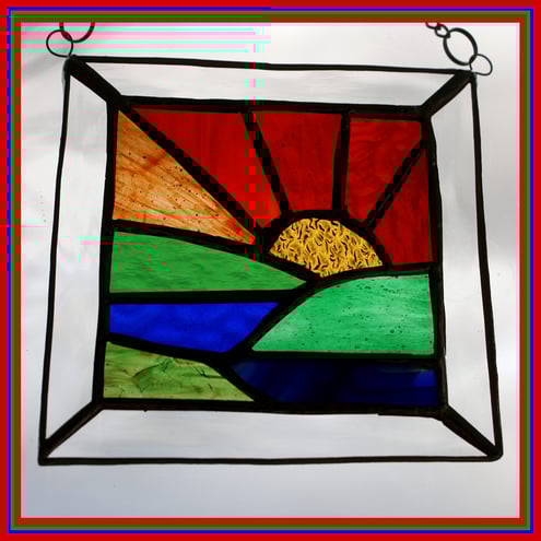 The sun's rays are made from 5 different colours and textures of red and amber glass and the sun is a sparkly texture of gold. The fields are in 3 different types of green glass and the sea in 2 shades of blue. A little bit of white edging at the top of the front piece of blue depicts the water breaking on the sea shore.