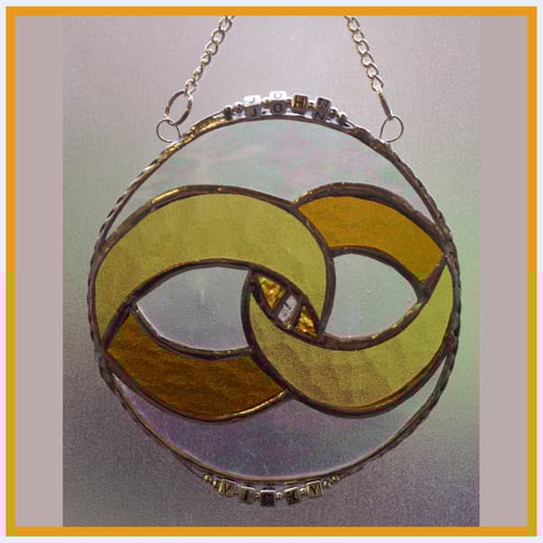 The rings are made from 3 different colours and textures of golden coloured glass. The background glass round the two rings is clear but iridescent with a gentle texture to give the suncatcher a bit of a shine and to highlight the rings.
