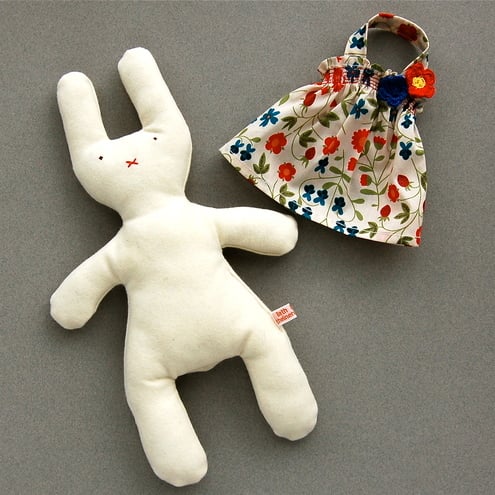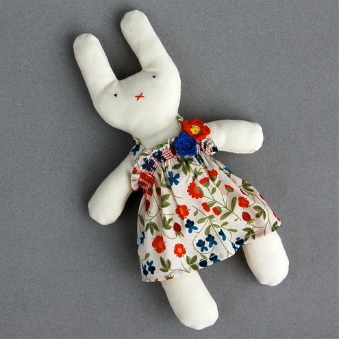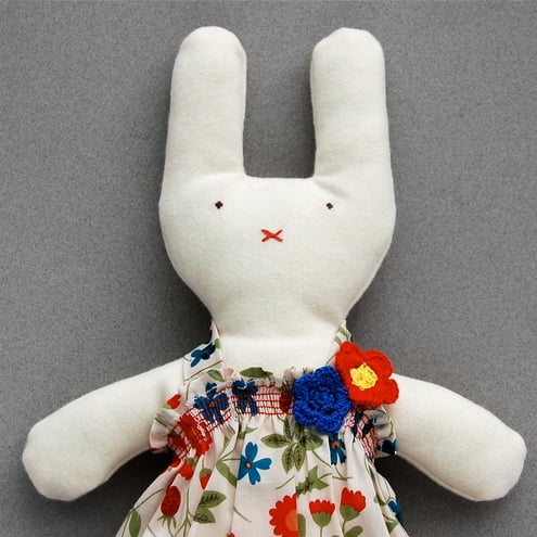 Wool flannel bunny with polyester safety filling and hand embroidered face.