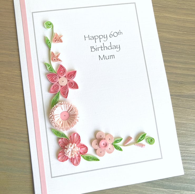 A beautiful quilled card with quilling flowers in pretty shades of pink for a very special person.
