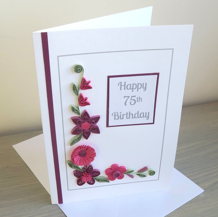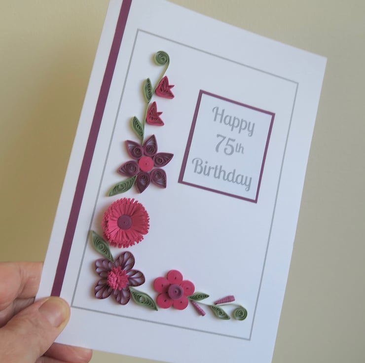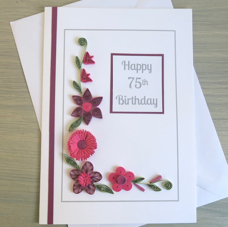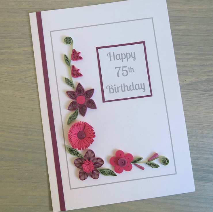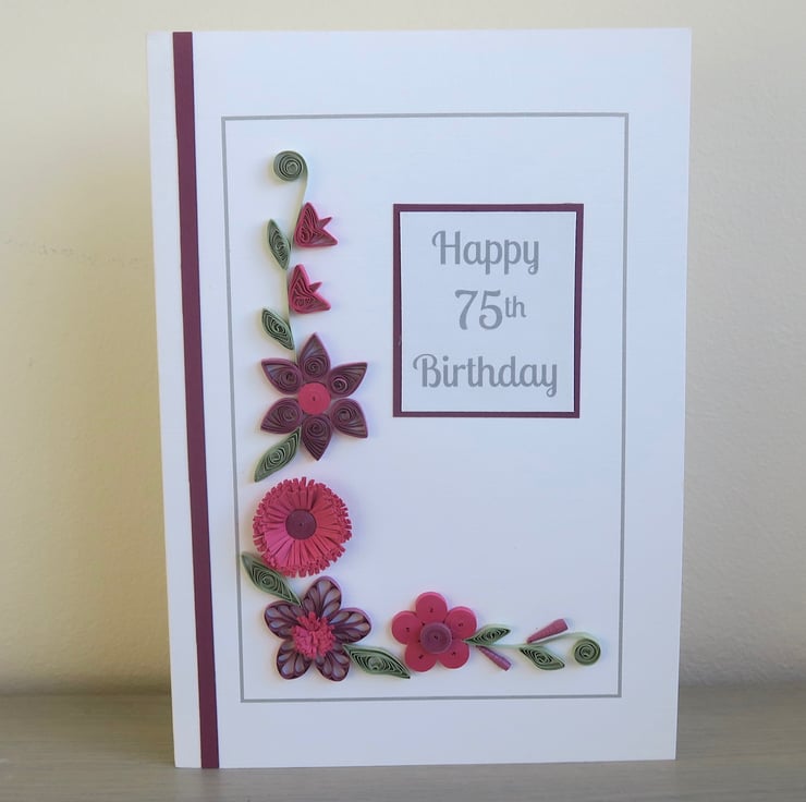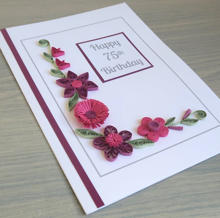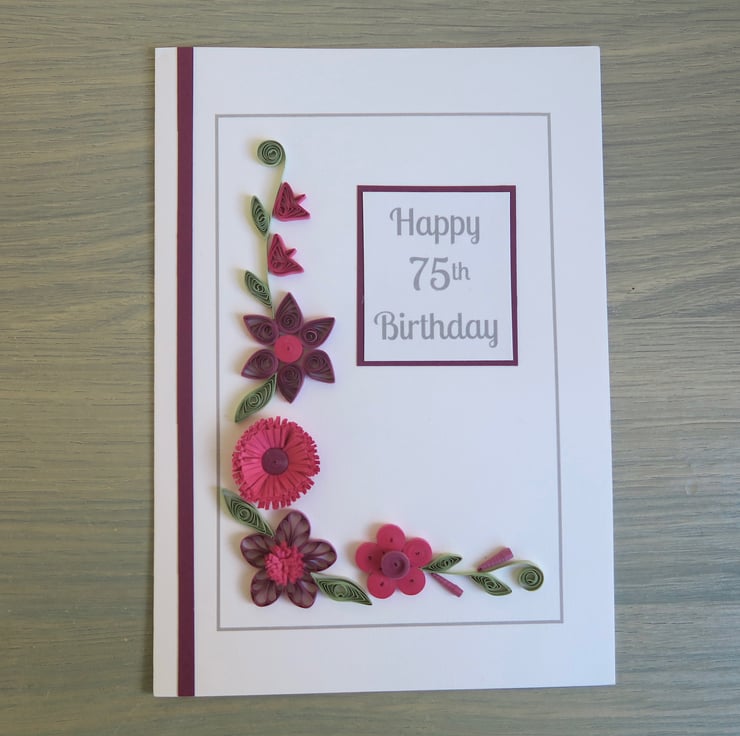 A beautifully special quilled 75th birthday card with quilled flowers in pretty shades of dark pink to help a very special person celebrate a milestone birthday.