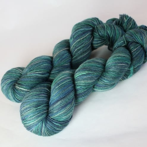 In shades of green, teal and beige with a little grey, khaki and beige, this yarn reminds me of a stormy sea. This