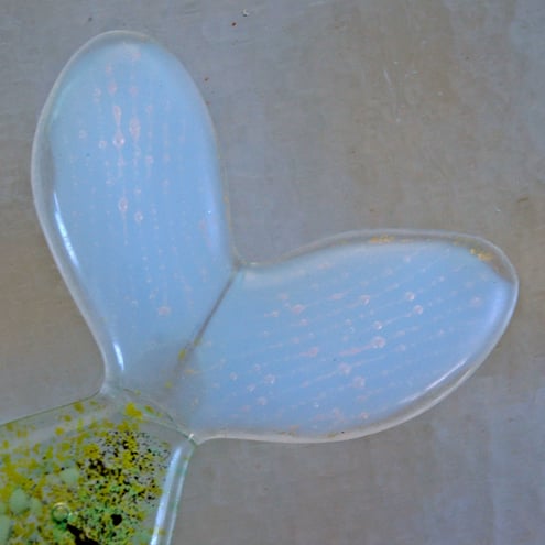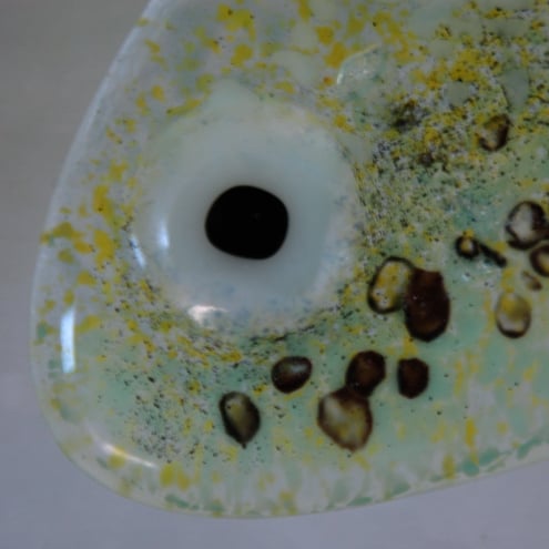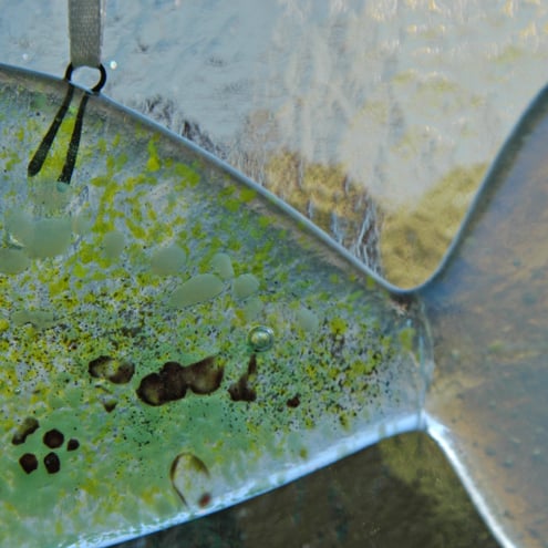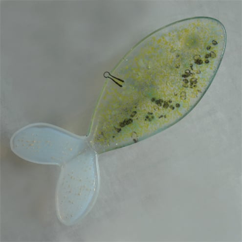Created from layered Bullseye sheet and ground glass in my Whitstable workshop. The body, eye and fins are all hand cut and fused separately before being joined in another firing with the hanging wire secured in place. Final adjustments are made to the shape and then the whole piece is fired again. A white satin ribbon is attached to complete the design.