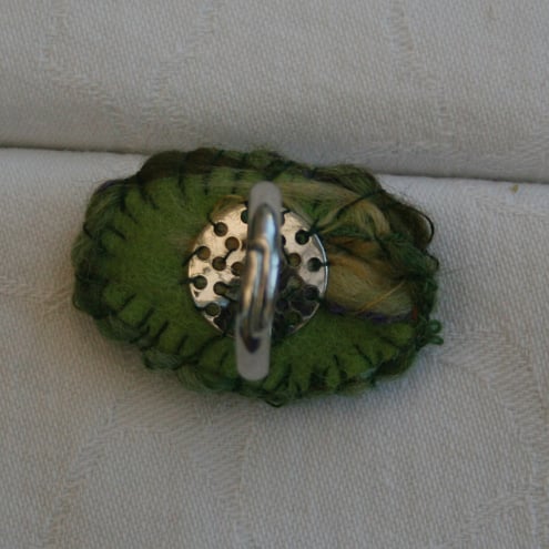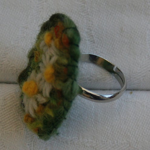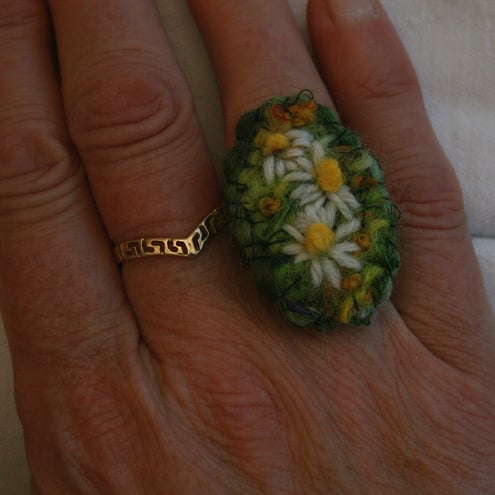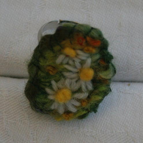 Daisies are embroidered in wool on a hand knitted and fulled background. The embroidery, backed with felt is mounted on an adjustable ring.