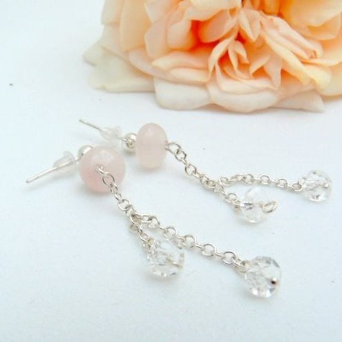 These earrings are on an a sterling silver ball ear post, with sterling silver chain, beautiful rose quartz and 2 flat faceted clear glass beads.
