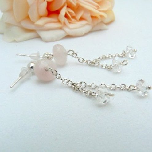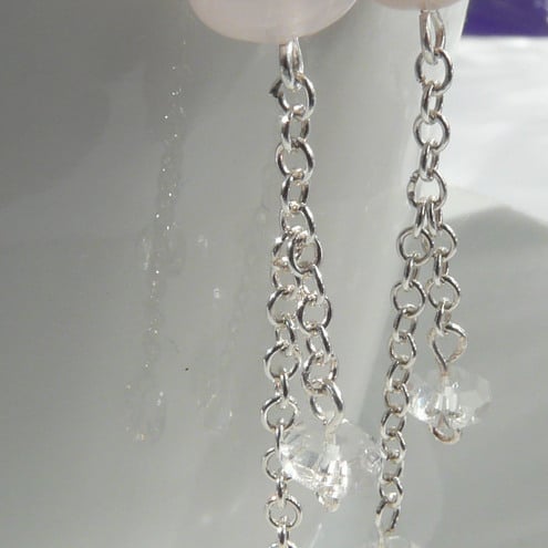These earrings are on an a sterling silver ball ear post, with sterling silver chain, beautiful rose quartz and 2 flat faceted clear glass beads.