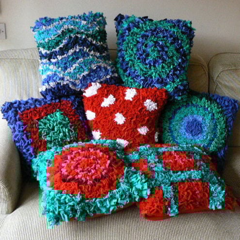 I create the design for my cushions using a rag rugging technique called proggy rugging. The cushions are backed with fleece with a pillowcase style opening.