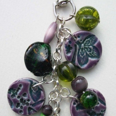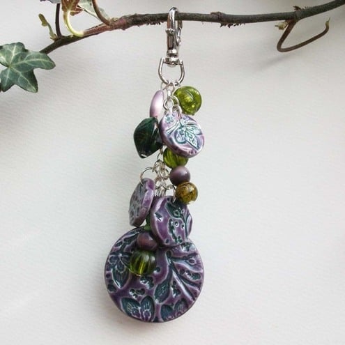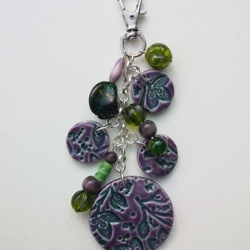 This lovely ceramic bag charm has 4 purple disks made from white earthenware clay, embossed and decorated with a rich purple glaze and complimented with a variety of non-ceramic beads.