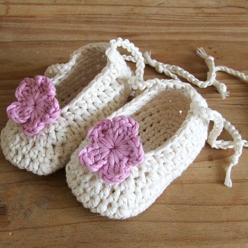 cute baby ballet bootees with a lovely flower embellishment, made from cotton or bamboo yarn