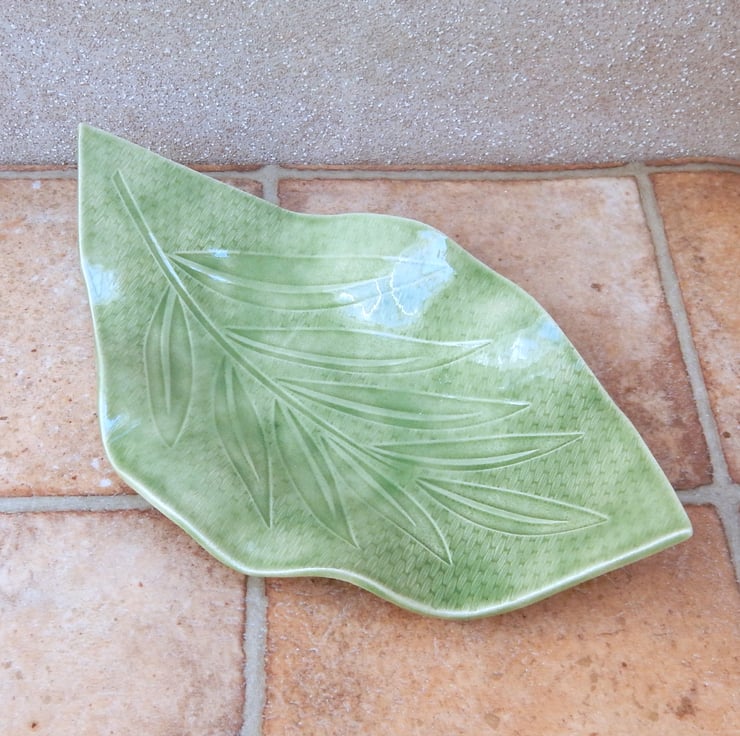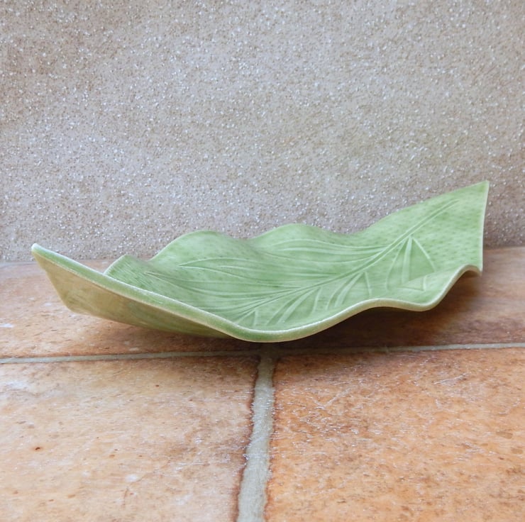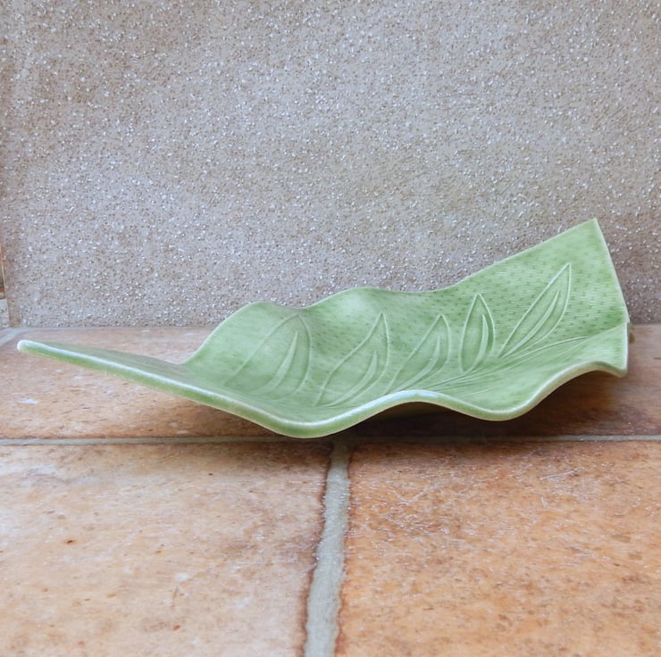 This dish was made with a rolled out piece of strong white stoneware clay which I have added a leaf imprint to and then moulded into a useful long dish shape.