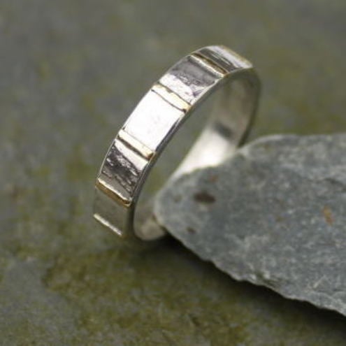 This is a 4mm wide rectangular silver band inlayed with 18ct gold. Hammered and burnished to a subtle shine. The gold sits slightly proud , creating a ribbed texture.
