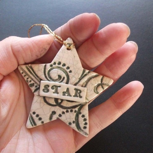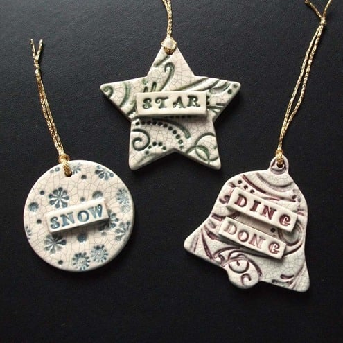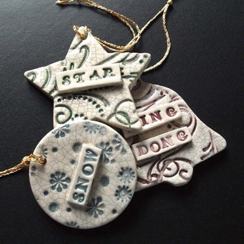 These shabby chic Xmas decorations are made from white earthenware clay and decorated with coloured slips and glazes.