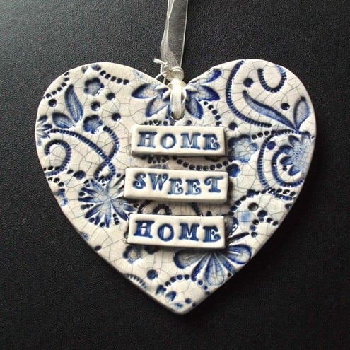 This ceramic heart is made from white earthenware clay and decorated with the words IHome sweet Home"