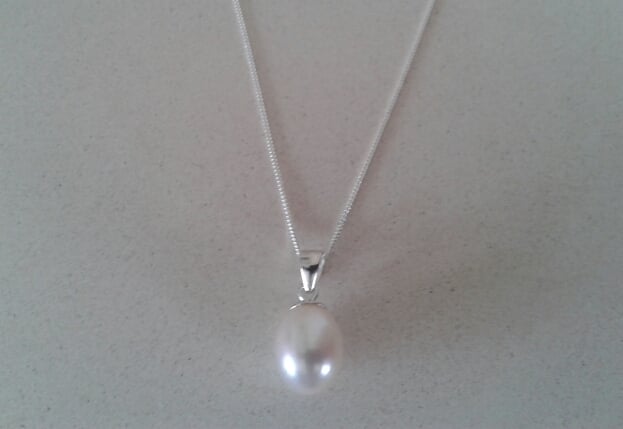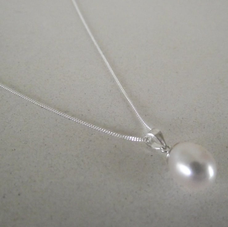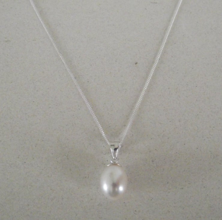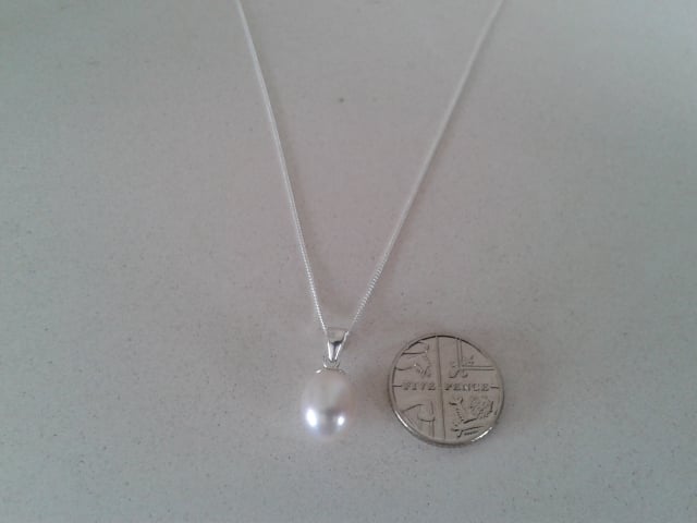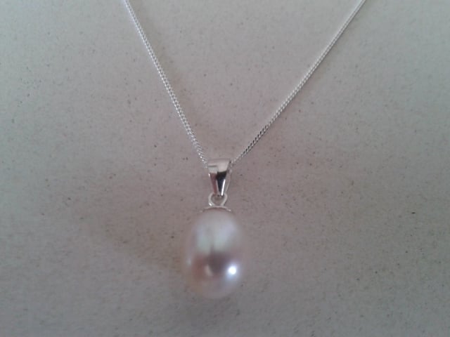 This is a single 8.5mm ivory white oval freshwater pearl on a sterling silver 16" curb chain. Ideal for those who prefer a more simple style of jewellery. The pearl is of AAA quality.