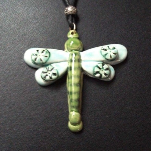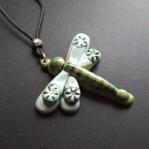 This beautiful double dragonfly is made from white earthenware clay and decorated in lovely, rich, turquoise and green glazes.