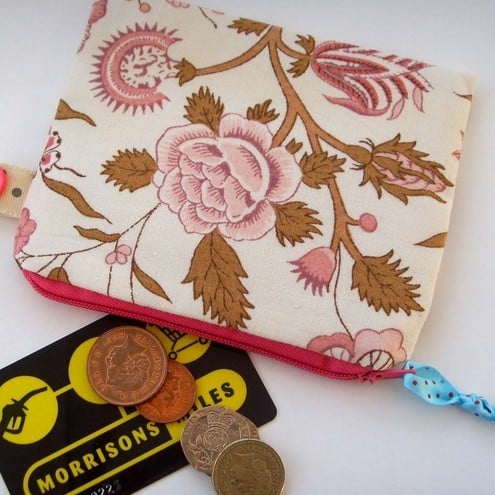 Cute little coin purse with contrasting zip, ribbon and lining.