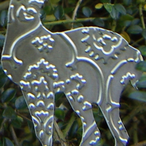 This is a set of 2 reindeer embossed Christmas decorations, made from soft art metal with a foam backing.
