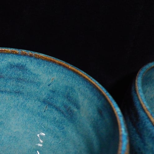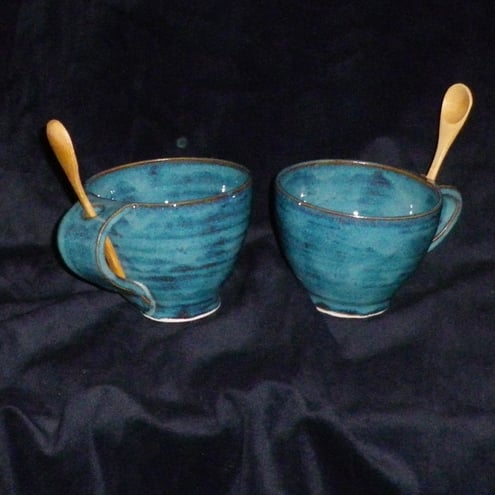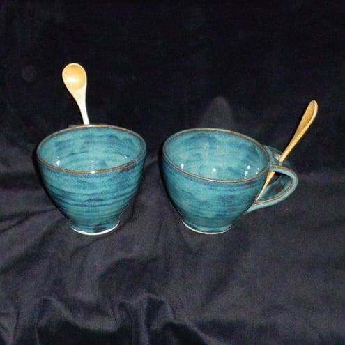 I threw them on my pottery wheel using strong white stoneware clay and glazed them with a beautiful dark sea greeny blue glaze.