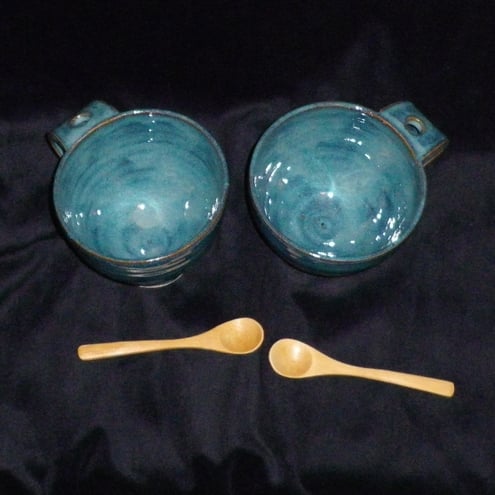 These soup mugs/bowsl have very comfortable wide handle with holes to hold the spoons.