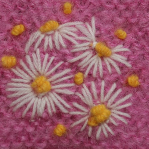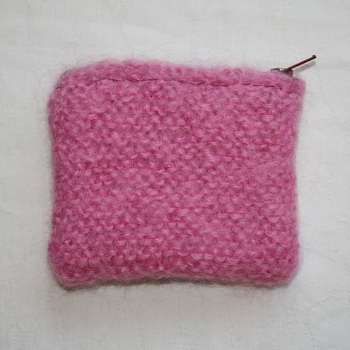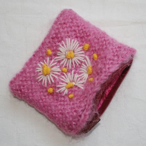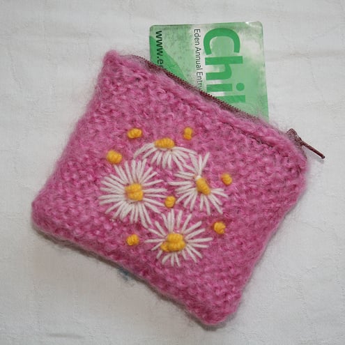 A pretty little purse for coins, cards or other small items, knitted in a mohair yarn and embroidered with daisies.