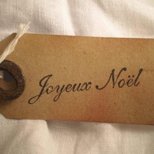 The background to this 1.5 x 3.5 inch luggage tag has been hand stamped and distressed and the sentiment " Joyeux Noel" added