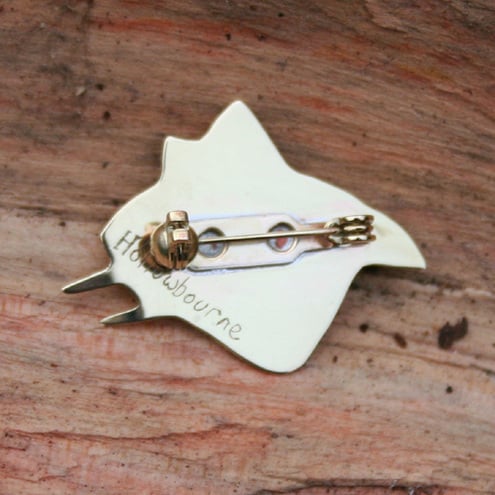 He is made from brass which has been etched by hand.He has a coat of lacquer and a safety catch soldered to his back.
