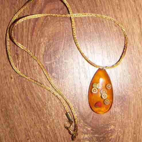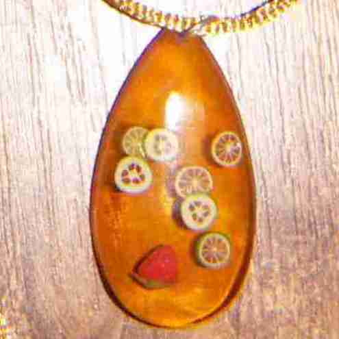 Teardrop shaped handmade resin pendant made from amber tinted resin, with added slices of polymer clay cucumber, strawberry, orange, lemon and lime. On a gold satin cord with silver plated fastenings. Approx height 1 1/2 inches.