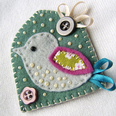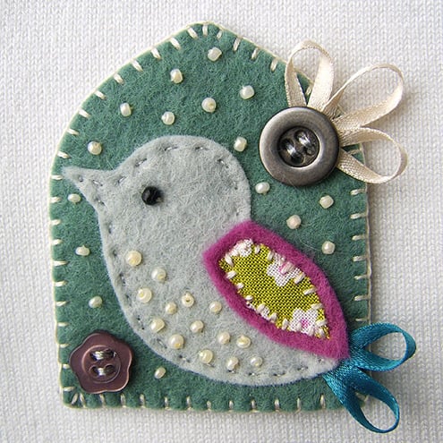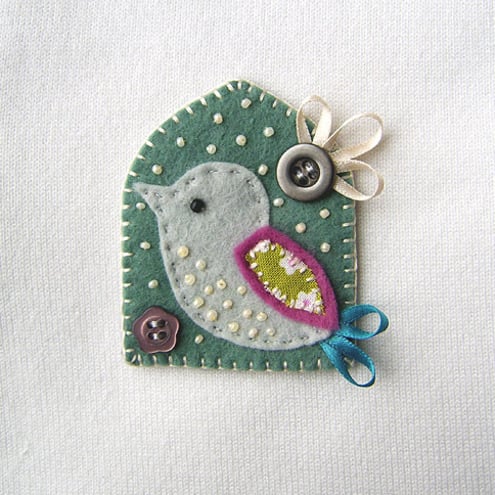 This is a lovely handmade fabric brooch. It features a sweet little bird with appliqued wing, beaded belly and pretty ribbon tail. It is mounted onto a teal arched shaped felt base which is decorated with coordinating beads. It is finished with a button and a ribbon detail and has a brooch backing for easy attachment.