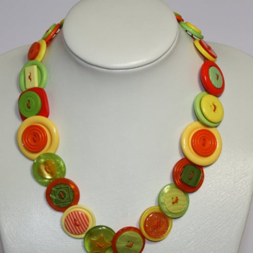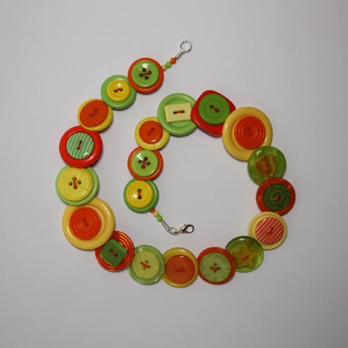 This distinctive button necklace is rich with an assortment of yellow, lime and orange coloured buttons.