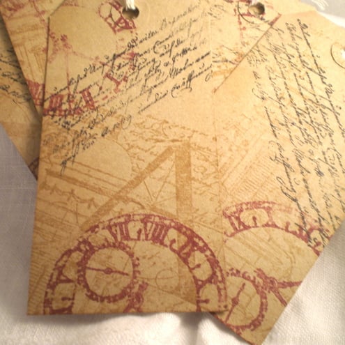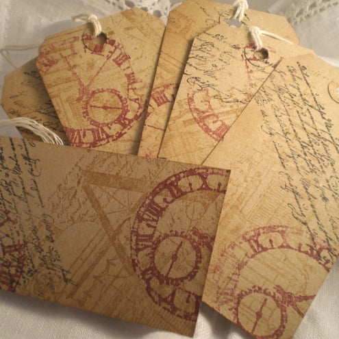 Each of these hand stamped gift tags is unique as the placement of the various stamps is always different. I used three stamps in this design a lovely Di Vinci style background, with a script on top and to finish the clock.