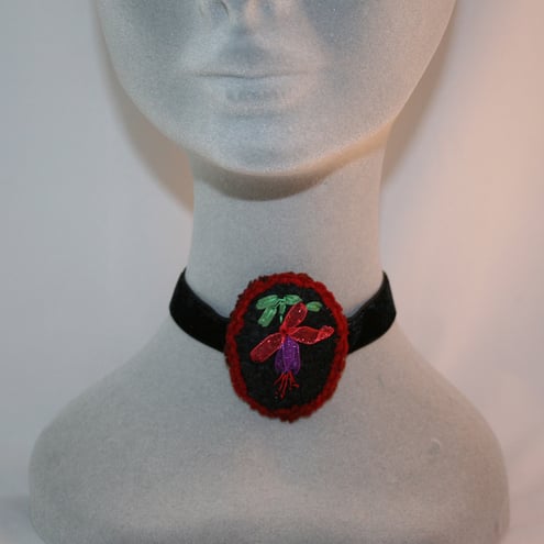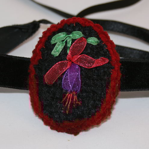 The design has been framed with two rows of couching over a chenille yarn - giving a velvet effect. The back of the panel has been neatened with black commercial felt. The panel has then been stitched to a length of velvet ribbon. Narrow satin ribbons have been stitched to the ends of the velvet and these may be used to tie the choker in place in a neat bow