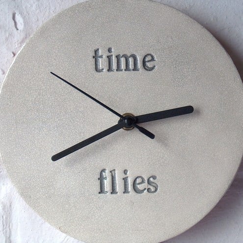 A pretty pendulum clock, made with quartz mechanism. The ceramic clock face is finished in a crackle glaze and decorated with the text 'Time Flies', in a grey underglaze. The pendulum is a little bird finished in the same glaze, which swings from side to side, and is attached with a wooden arm covered in pretty blue ribbon.