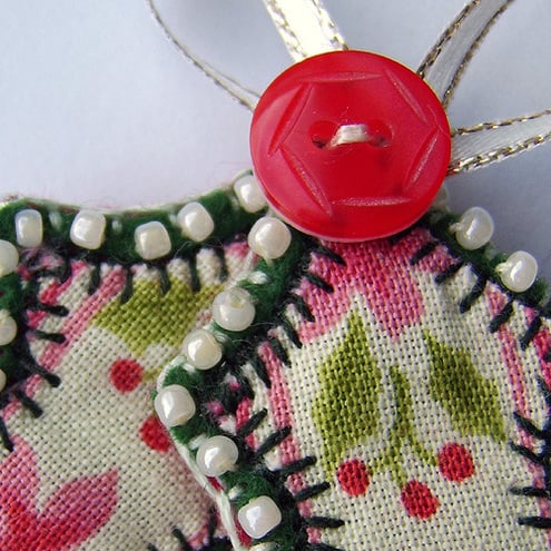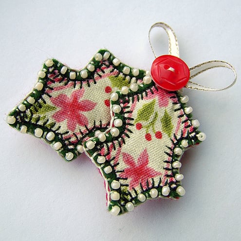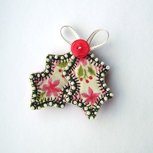 This is a gorgeous brooch in festive colours featuring two holly leaves in pretty cotton print fabric, appliqued onto a dark green felt base. They are beautifully edged with cream seed beads and finished with a button berry and ribbon detail. Brooch backing for easy attachment.