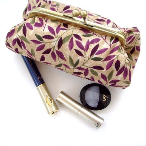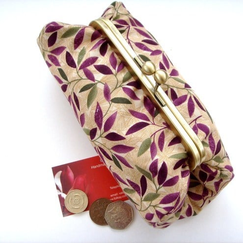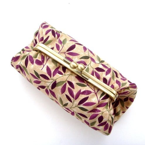 Perfect little clutch for your mobile phone, keys, sunglasses,change and credit cards or even a make-up bag. Pretty green and purple fabric with contrasting lining, padding and metal frame clasp.