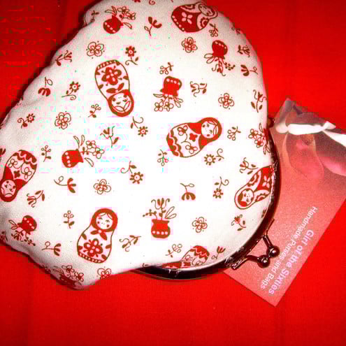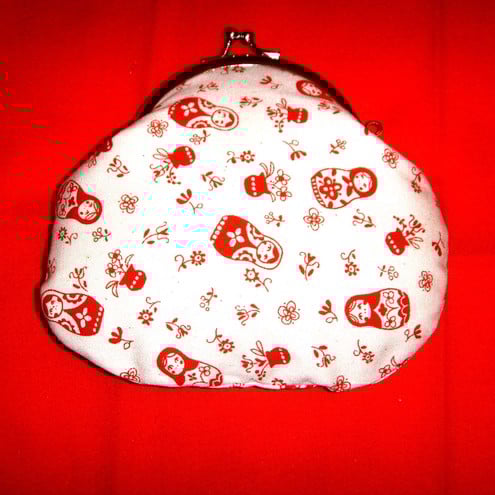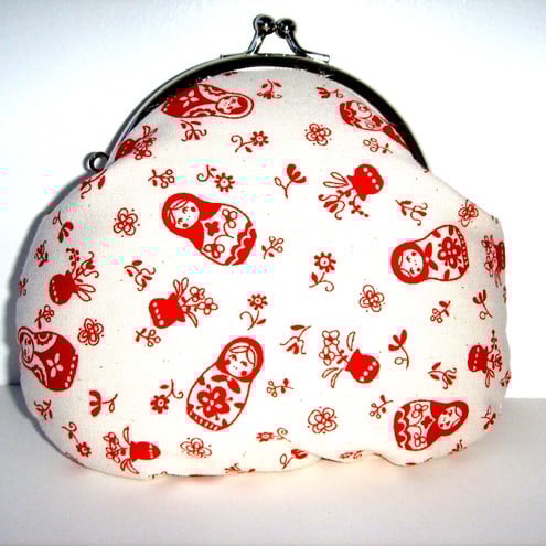 Perfect little purse for your keys, change and credit cards.Little Russian dolls fabric with contrasting lining, padding and metal frame clasp.