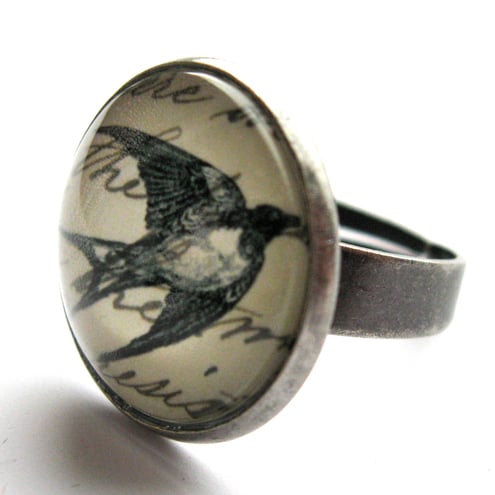 This is a gorgeous ring featuring an image of a swallow taken from a Victorian book illustration and combined with a script background.