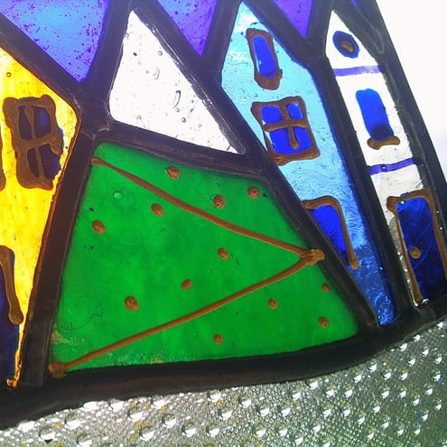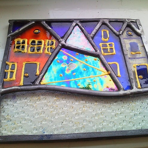 Add a seasonal touch to your home with a lovely quirky little winter village scene with houses and shops, fir trees and snow! Made from recycled and reclaimed stained glass, made using traditional leading techniques and painted detail. The Christmas tree uses glass with a fantastic iridescent luster and the textures of the clear glass suggest snow