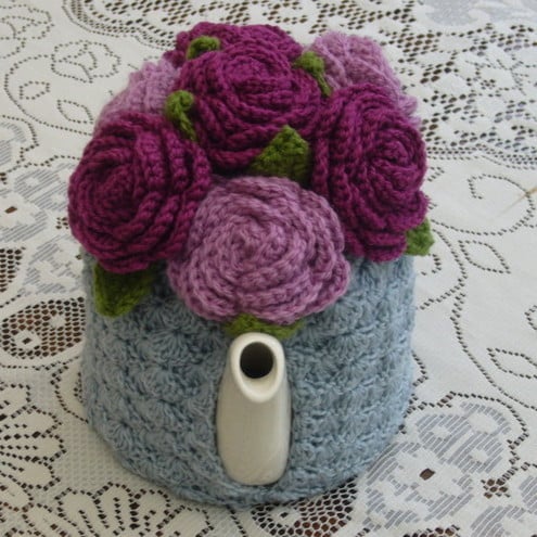 The cosy has been handmade using good quality yarn in grey. The top of the cosy is decorated with seven individual roses in plum and dusty pink with green leaves.