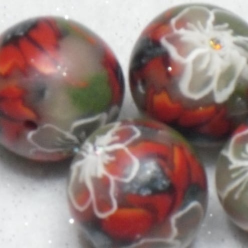 Hand crafted OOAK art beads. Very detailed poppy design with ghost layered flowers containing swarovski crystal centres - atleast 2 crystals per bead. These are so scrummy that I'm tempted to keep them. Measurements - approx. 1.75cm round with beading hole approx.1-2mm. Hand sanded and polished to a satin sheen. Presented in a matching organza bag.