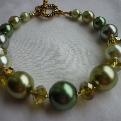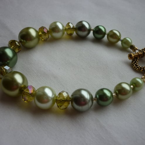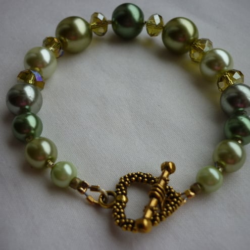 THE BEADS AND FINDINGS USED IN THE MAKEING OF THE BRACELET ARE GLASS PEARLS IN DARK GREEN, OLIVINE GREEN, BABY LIME AND PEARLY GREEN. THE SIZES OF THE BEADS ARE 12MM, 10MM, 8MM AND 6MM. OTHER BEADS USED IN THE BRACLET ARE GLASS FACETED HAND CUT RONDELLE BEADS IS GOLDEN GREEN, HEX CUT GOLD SEED BEADS AND GREEN/BRONZE SEED BEADS. THE BRACELET HAS BEEN FINISHED WITH A FANCY GOLD PLATED HEART SHAPED TOGGLE CLASP AND FINDINGS.