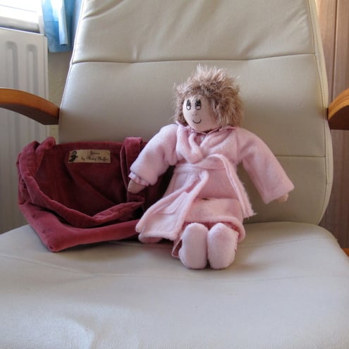 Jessica is so cute. She is dressed in pink gingham pyjamas with pockets decorated with sequines and a really soft pale pink dressing gown. She has soft pink slippers to match. Jessica comes in a pink velvet carry bag lined with pink gingham. A beautiful Christmas present for a little girl.