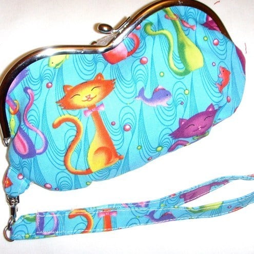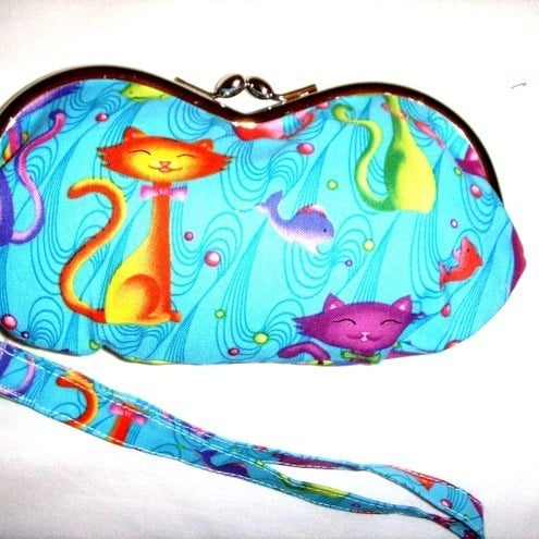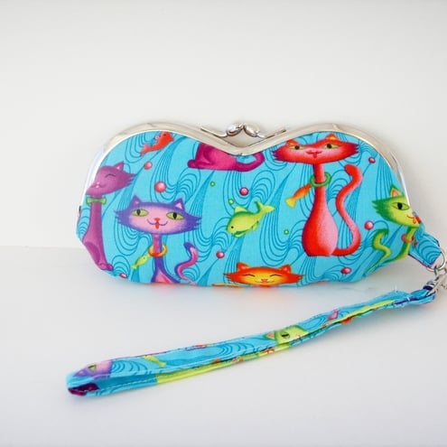 Charming little wristlet purse for sunglasses or mobile phone in pretty turquoise fabric with contrasting green spotty lining and removable wrist strap. Measures approx 7"x3.5"