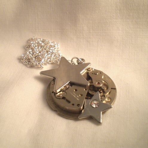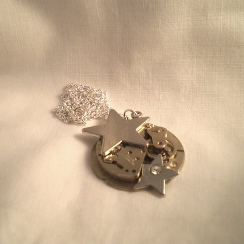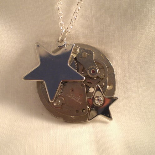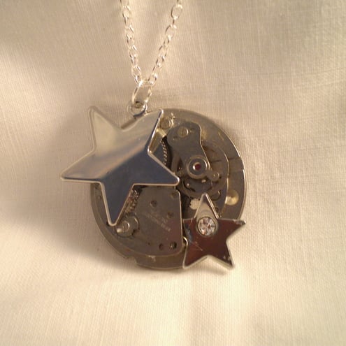 Here is a unique Star Time Steampunk necklace... not to be found on the High Street... A Vintage pocket watch movement has been adorned with a larger silver star and a smaller one, accented with a clear sparkling clear crystal.