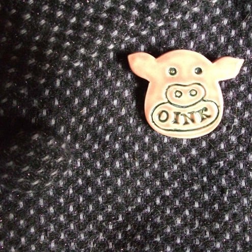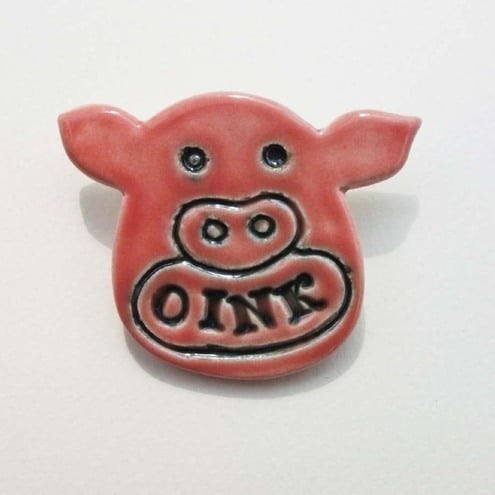 This cute little pig brooch is made from white earthenware clay, imprinted with the word "oink" and glazed in a juicy piggy pink glaze.