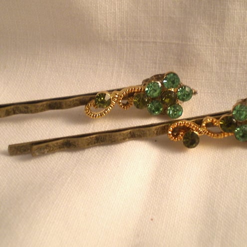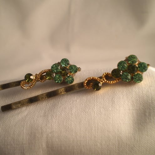 Two gorgeous flower spray hair pins, created from recycled Swarovski (no logo) earrings, beautiful Christmas green crystals.. Keep one and give the other as a gift...Perfect to add sparkle to your hair this festive season