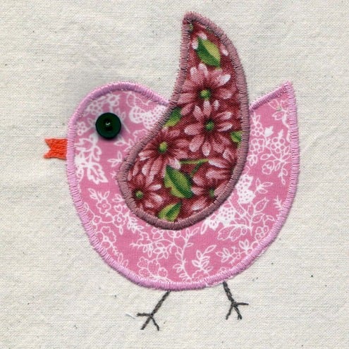 15" (38cm) square cushion with appliqued pink and lilac birds on a good quality calico fabric.