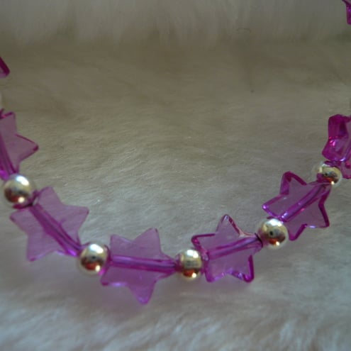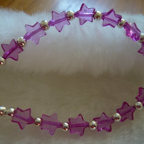 This is a 7" bracelet including clasps. It is made up of small pink stars and silver plated spacer beads.