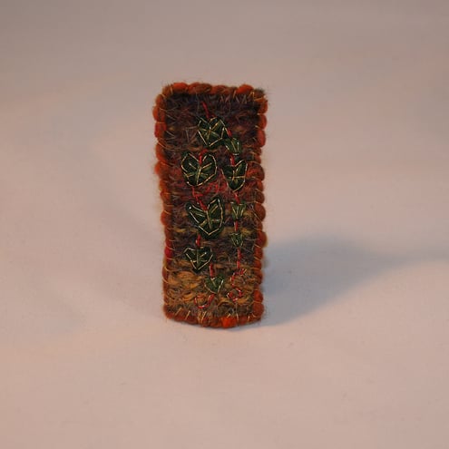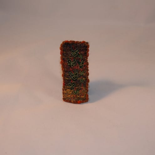 The background has been knitted in a mohair yarn, then fulled, or felted, to give a closer texture. This knitted background has then been machine basted to a thick wool fabric. The leaves are embroidered in ribbon, enhanced with stitching in embroiderey thread and metallic gold thread to represent the veins. The tendrils are stitched in embroidery thread and highlighted with gold thread. The design is framed with a row of couching over pure wool, tweed yarn, accentuating the colours of the background.